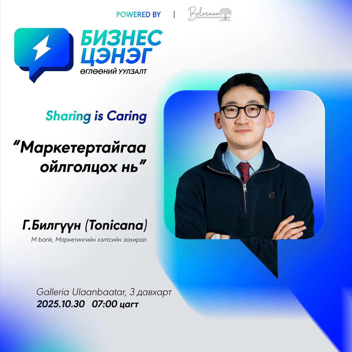 Мөн M bank-ийн маркетингийн хэлтсийн захирал Г.Билгүүн (Tonicana) “Маркетертайгаа ойлголцох нь” сэдвээр бизнесийн алсын хараа ба маркетингийн стратегийн уялдаа холбоог танилцуулна. Тэрбээр 2014 онд найзтайгаа хамт хөгжмийн мэдрэмж, дүрслэлийг хослуулсан “Cafune” нэртэй радиог YouTube-д хийж, тухайн үед залуусын хамгийн дуртай хөгжмийн комьюнитиудын нэгийг бүтээж байв. Харин сүүлийн жилүүдэд “Kleenex” брэндийн хошин, мэдрэмжтэй постуудаар сошиал маркетингт шинэ өнгө төрх, өөрийн хэв маяг, жишгийг бий болгосон юм.
