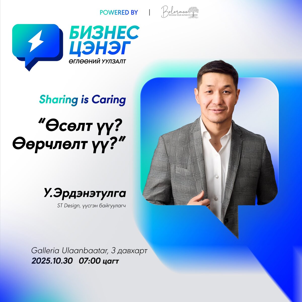 Ийм л амьд, эрч хүчтэй орон зайг манай хамт олон сар бүр “Бизнес цэнэг” өглөөний уулзалтаараа бий болгодог билээ. Уулзалтаас оролцогчид зөвхөн чиглэл бүрийн шинэ соргог мэдээлэл, трендийг сонсохоос гадна цөөнгүй нь ирээдүйн хамтрагчаа олж, бизнесийн шинэ боломжийг бүтээж чаддаг. Тэгвэл амжилтын түүх, манлайллын ухааныг бодит туршлагаар хуваалцдаг “Бизнес цэнэг” өглөөний уулзалт энэ сарын 25-нд Галлериа Улаанбаатар-н 3 давхарт болох гэж байна.
